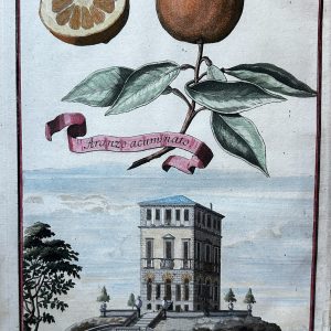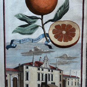 This is an antique botanical print titled “Pompelmus Orientalis,” or Pomelo/Shaddock, from Johann Christoph Volckamer’s comprehensive work on citrus, Nürnbergische Hesperides, published between 1708 and 1714. The print is a hand-colored engraving by Joseph de Montalegre. It depicts a specific variety of citrus floating above an Italian landscape featuring the Palazzo del N. H. Venier at Moncelice. Volckamer was a Nuremberg merchant and botanist who documented the exotic citrus fruits grown in European orangeries during the 18th century.